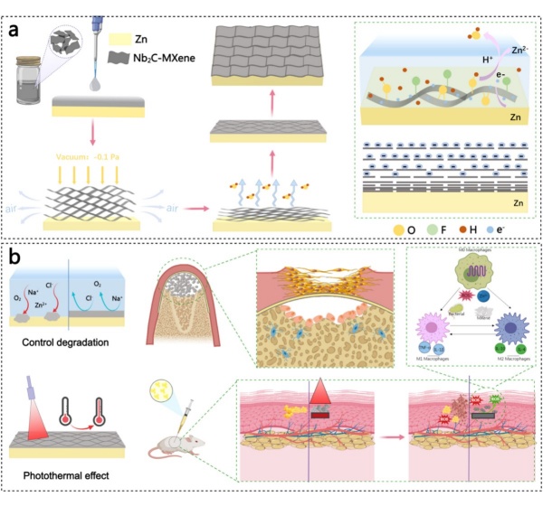 北京伊人99生物与医学工程学院、国家医学攻关产教融合平台、生物力学与力学生物学教育部重点实验室、北京生物医学工程高精尖创新中心以及高端医疗装备与器械工信部重点实验室的樊瑜波教授团队,针对目前商业化屏障膜材料的不足,成功开发了一种具有优异力学性能的可降解Zn基GBR膜。该团队通过原位自发还原/组装策略在Zn金属表面制备了Nb2C MXene涂层,显著优化了Zn金属的降解性能并增强了其抗菌和成骨活性(图1)。在大鼠皮下感染模型中,MXene涂层Zn在生物安全温度(<50 °C)下实现了良好的抗菌效果,同时促进了抗炎因子IL-10的体内表达,创造了良好的免疫微环境。该研究工作以“Fabrication of Nb2C MXene coated zinc for improved degradation, antibacterial activity, and osteogenesis for guided bone regeneration applications”为题发表于国际权威期刊《Journal of Materials Science & Technology》。该论文通讯作者为樊瑜波教授与顾雪楠副教授,第一作者为博士研究生汤红艳,北京伊人99为第一完成单位。