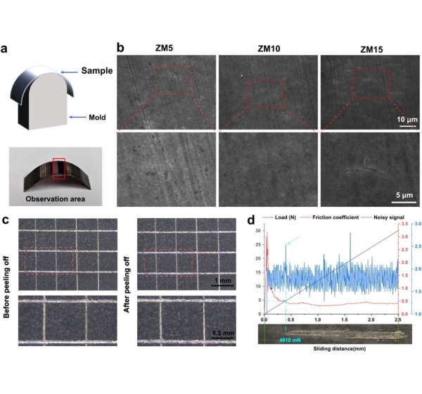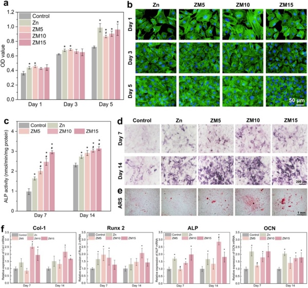 本研究通过原位自发还原/组装策略在纯Zn表面沉积了不同浓度的MXene。MXene纳米片表面的含氧基团与Zn之间存在很强的相互作用,使其能与Zn基底紧密结合。在临床应用中,GBR膜通常需要弯曲和塑形以匹配患者骨缺损区域的轮廓。因此,通过弯曲实验、划格法和微划痕法表征了MXene涂层与Zn基底的结合强度。弯曲后,ZM5和ZM10的涂层保持完整,而ZM15涂层出现裂纹。ZM10样品的MXene涂层对Zn基体表现出优异的附着力,结合强度为4810 mN,划格测试后几乎没有脱落或分层,达到了0级标准(图2)。涂层与Zn基底良好的结合强度和抗弯曲开裂性能可以有效防止手术过程中涂层的开裂和脱落。