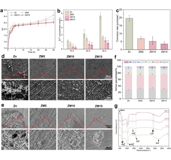 降解对于Zn基GBR膜至关重要,因为它不仅损害机械完整性和屏障功能,还可能导致Zn2+的快速释放,影响骨再生过程。MXene纳米片在Zn表面有序堆积,形成了密集的物理屏障,产生的迷宫效应可以有效延长腐蚀溶液的扩散路径。同时,MXene优异的导电性使电荷能够在MXene涂层中快速转移,在Zn基底表面产生均一的电场,促进其从局部腐蚀向均匀腐蚀模式转变。如图4所示,MXene涂层有效地将Zn基底降解速率降低了55%-74%, 并促进了其更均匀的降解。