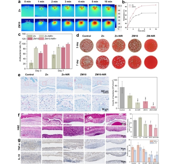 在大鼠皮下感染模型中(图6),MXene涂层Zn在深层组织中实现了有效的光热转换,在NIR-II照射10 min后温度升高至49.3 °C。由于光热效应和Zn2+的协同抗菌机制,在低于完全消灭细菌的温度(60 °C)阈值下,MXene涂层Zn仍然实现了近100%的抗菌效果,最大限度地减少了局部过热对组织造成的损伤。H&E和免疫组化染色结果表明,MXene涂层Zn在光热作用下高效的自由基清除活性,有效缓解了机体的炎症反应并促进了抗炎因子IL-10的表达,有利于创造良好的免疫微环境。